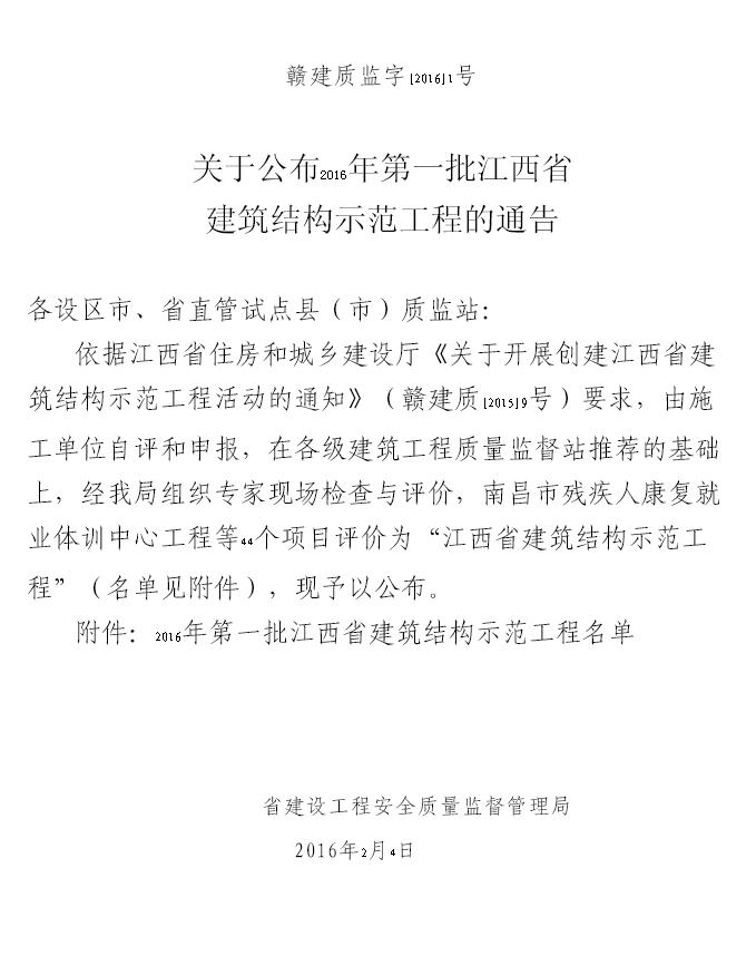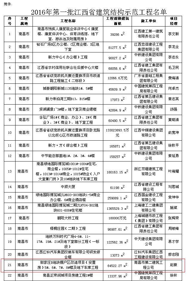 由南昌市第二建筑工程公司承建的郭家莊B地塊棚戶區(qū)改造項(xiàng)目(安置房)5#、6#7#、8#樓及地下車(chē)庫(kù)工程獲“2016年第一批江西省建筑結(jié)構(gòu)示范工程” [摘自贛建質(zhì)監(jiān)字[2016]1號(hào)]。
