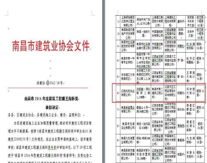 南昌市第二建筑工程公司承建的洪客隆·英倫聯(lián)邦二期1#樓、10#樓工程榮獲南昌市2016年度建筑工程滕王閣杯獎(jiǎng)。[摘自南昌市建筑業(yè)協(xié)會(huì)文件洪建協(xié)〔201618號(hào)]