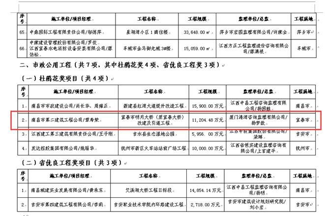 由南昌市第二建筑工程公司承建的江西旺旺新建廠房1#車(chē)間工程獲“2015年度江西省優(yōu)良工程獎(jiǎng)”,宜春市明月大橋(原宜春大橋)改建及引道工程榮獲“2015年度江西省杜鵑花獎(jiǎng)”[摘自江西省住房和城鄉(xiāng)建設(shè)廳文件贛建質(zhì)字[2016]5號(hào)]。